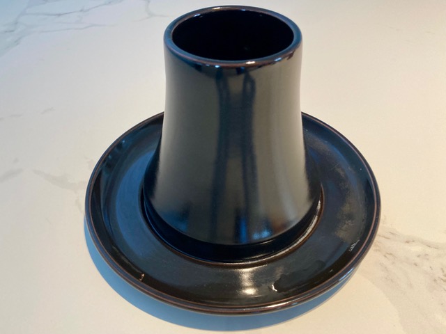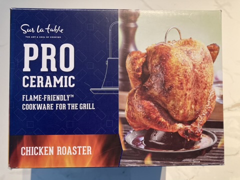 To roast the chicken, our go-to device is this vertical roaster. We add water to the cavity of the roaster, mount the hen, clip (or tuck under) the wing tips, and tie the wings to the breast using kitchen twine.